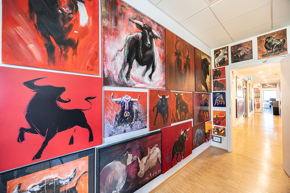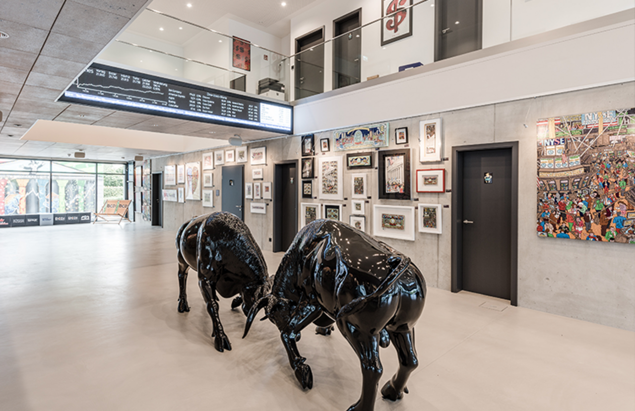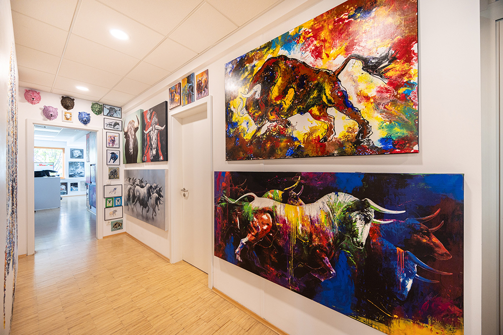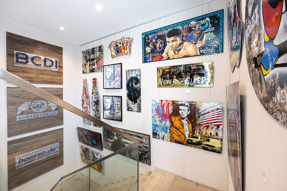 Darüber hinaus ist Thomas Müller ein leidenschaftlicher Sammler von zeitgenössischer Pop-Art, 3D-Kunstwerken (Unikate und Serigrafien von Fazzino, Rizzi, Suchy) und Bildern, die Börse und Finanzen zum Thema haben. So versprühen in beiden Häusern hunderte farbenfroher Drucke, Lithografien und Ölbilder pure Lebensfreude und aus der Liebe zur Gute-Laune-Kunst (die sogar in eigene Editionen bis hin zum „Rosenheim 3D“ von John Suchy mündete) ist schließlich die „Bulle 8 Galerie“ entstanden.